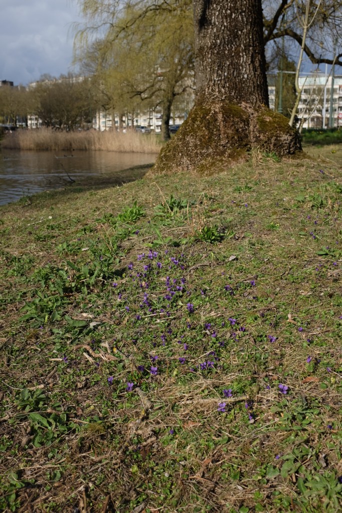 Sweet violet (Viola odorata) growing by the ash tree (Fraxinus excelsior)